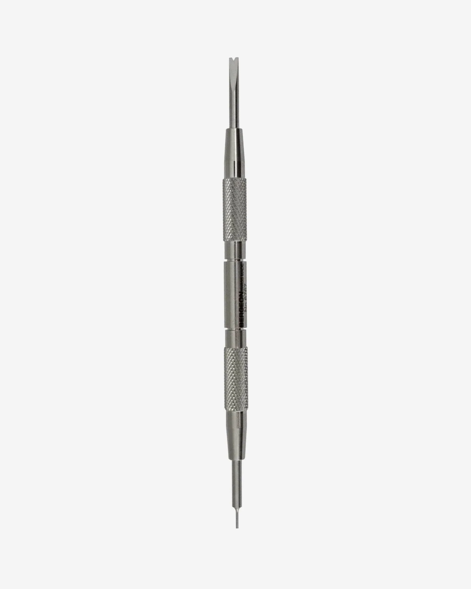 The tool's ergonomic design, featuring a knurled handle, provides a secure and comfortable grip, making it perfect for delicate tasks such as adjusting watch bands or repairing watch clasps. Each tip is removable and features identical threading, allowing for easy and convenient replacement as needed.
