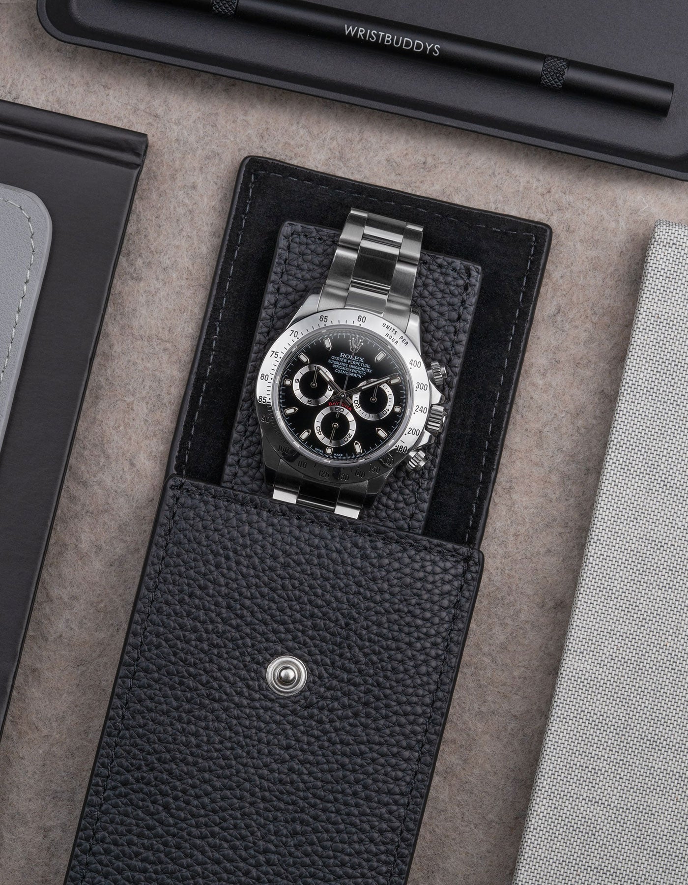 Crafted from cow leather with a soft suede lining, this pouch guards luxury watches like Rolex and Omega against scratches.