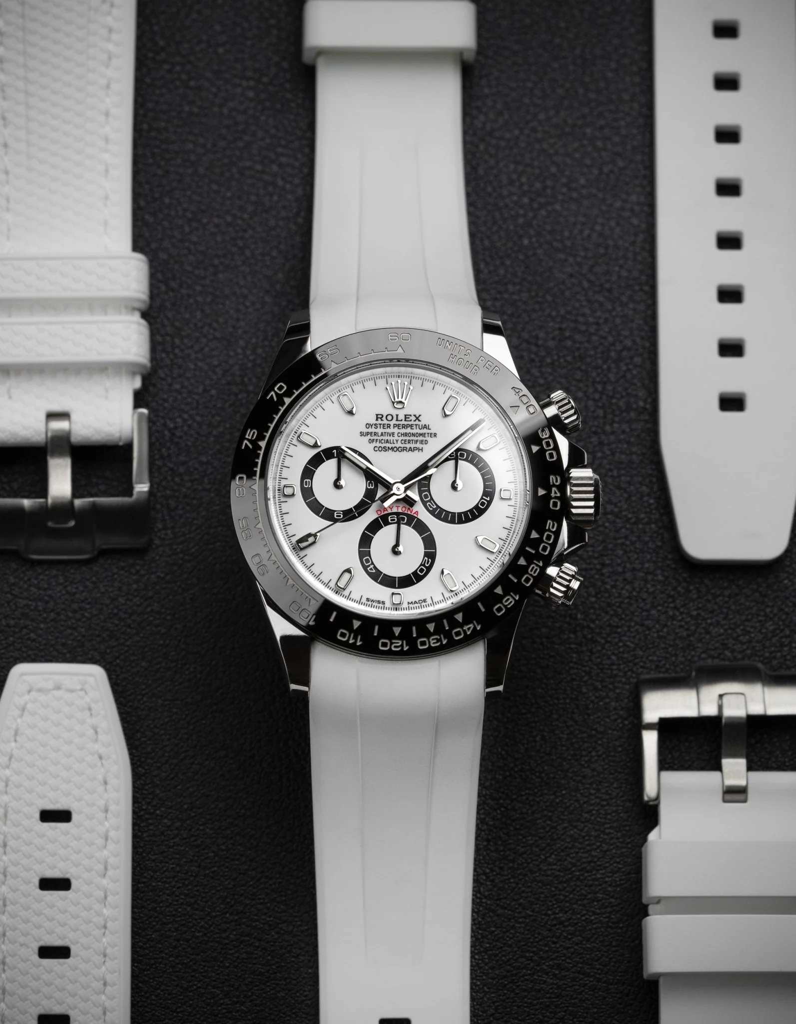 This white curved FKM rubber strap is designed to bring a crisp, modern contrast to the Rolex Daytona while sitting cleanly and naturally against the case. The curved profile follows the lines of the watch without gaps, giving a seamless look on the wrist that feels considered and intentional. In white, the strap highlights the Daytona’s dial and bezel in a way that feels fresh and confident, especially during warmer months. Crafted from premium vulcanized FKM rubber, it offers a smooth, comfortable feel on the wrist and works just as well for everyday wear as it does when you want the watch to stand out a little more. Supplied with a stainless steel buckle, the strap comes as a complete and well-balanced solution for the Daytona.