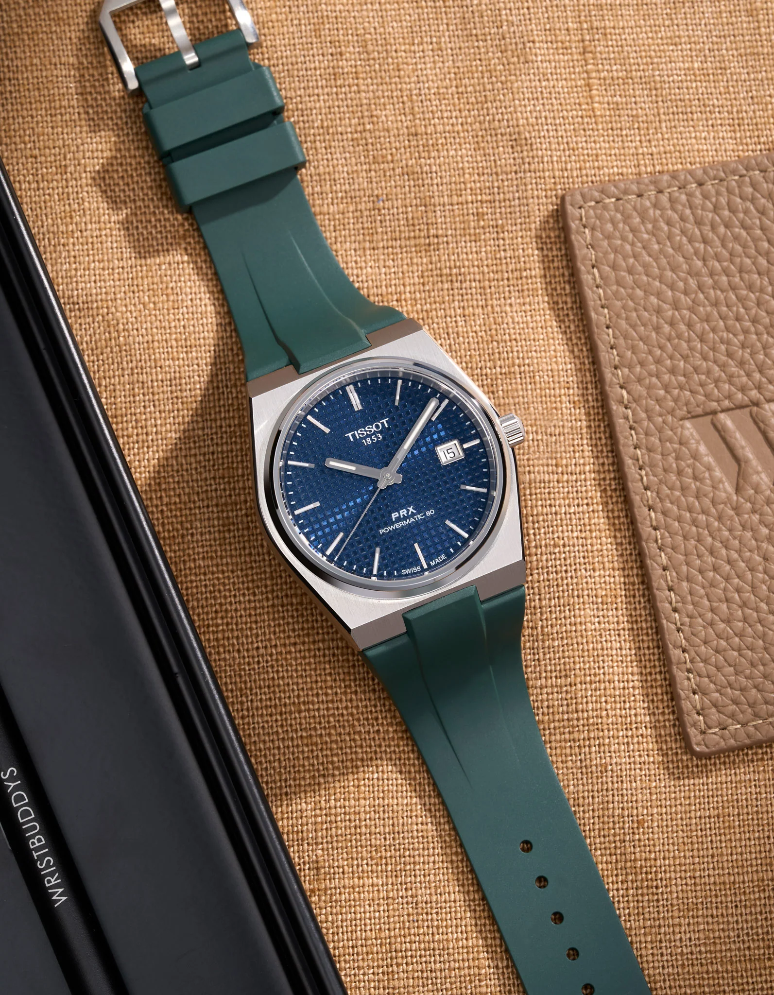 This green FKM rubber strap is developed specifically for the Tissot PRX Powermatic 80 40mm and shaped to sit seamlessly against the case for a clean and integrated look. The green tone adds a subtle contrast to the PRX design, giving the watch a slightly more relaxed and distinctive character without taking attention away from its sharp lines. Produced from premium vulcanized FKM rubber, the strap feels soft and comfortable on the wrist and works effortlessly for daily wear. A popular choice among Tissot enthusiasts, it offers an easy way to personalise your PRX while keeping the overall look balanced and refined. Available in two sizes and simple to change at home, it is a practical and good looking alternative to the original steel bracelet.